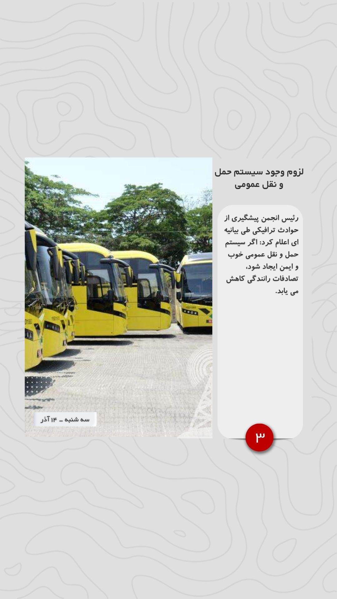 رئیس انجمن پیشگیری از حوادث ترافیکی طی بیانیه ای اعلام کرد: اگر سیستم حمل و نقل عمومی خوب و ایمن ایجاد شود، تصادفات رانندگی کاهش می یابد.