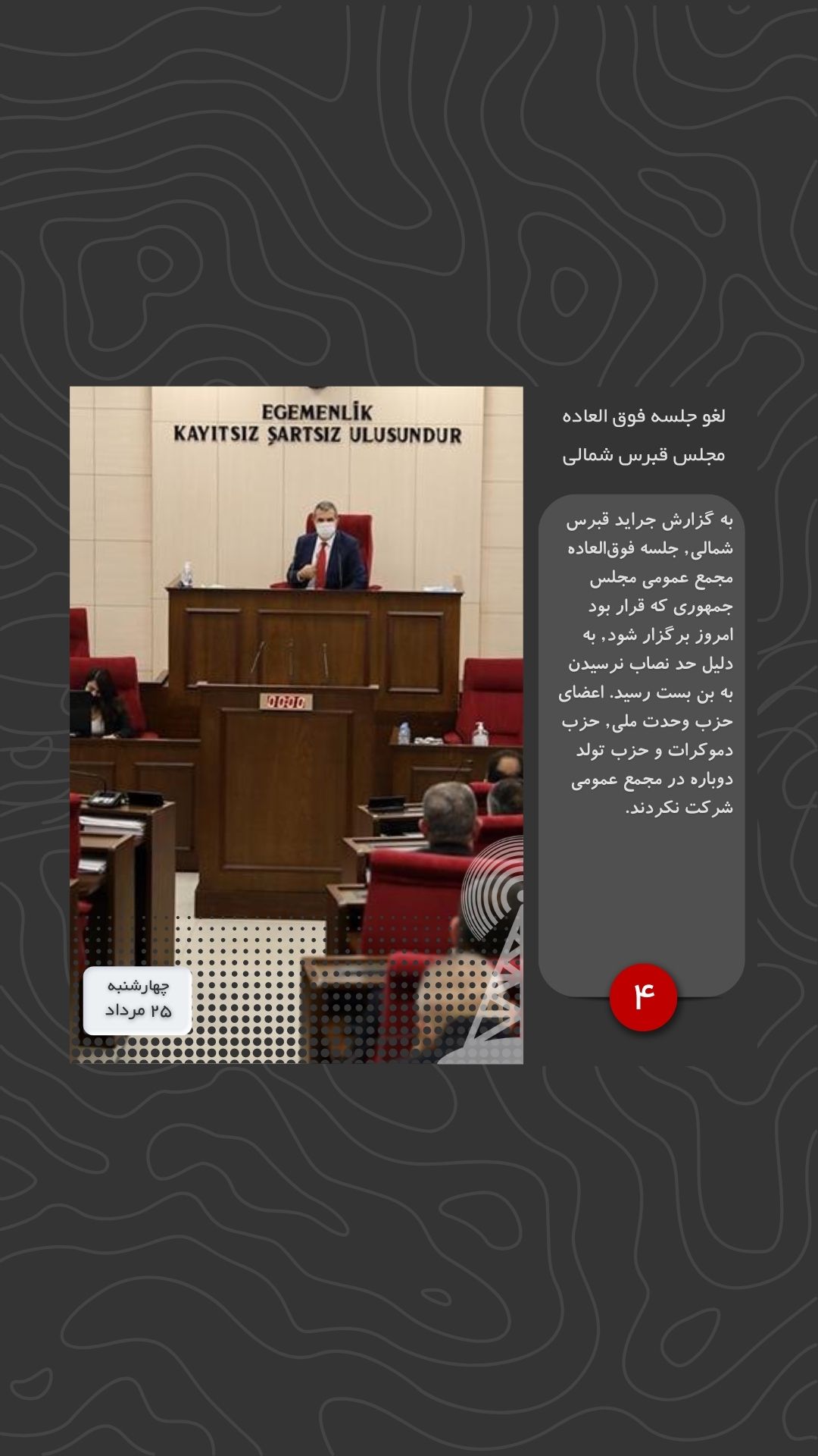 به گزارش جراید قبرس شمالی, جلسه فوقالعاده مجمع عمومی مجلس جمهوری که قرار بود امروز برگزار شود, به دلیل حد نصاب نرسیدن به بن بست رسید. اعضای حزب وحدت ملی, حزب دموکرات و حزب تولد دوباره در مجمع عمومی شرکت نکردند.