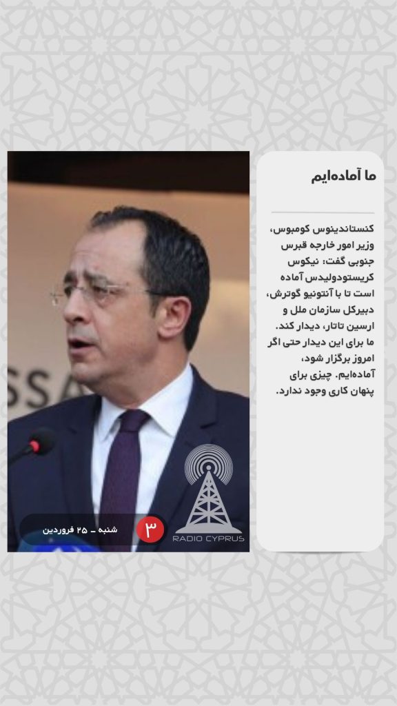 کنستاندینوس کومبوس، وزیر امور خارجه قبرس جنوبی گفت: نیکوس کریستودولیدس آماده است تا با آنتونیو گوترش، دبیرکل سازمان ملل و ارسین تاتار، دیدار کند. ما برای این دیدار حتی اگر امروز برگزار شود، آمادهایم. چیزی برای پنهان کاری وجود ندارد.