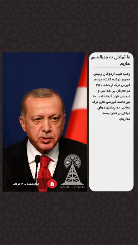 رجب طیب اردوغان رئیس جمهور ترکیه گفت: مردم قبرس ترک از دهه ۱۹۶۰ در معرض بی عدالتی و تبعیض قرار گرفته اند. ما نیز مانند قبرسی های ترک تمایلی به پیشنهادهای مبتنی بر فدرالیسم نداریم.