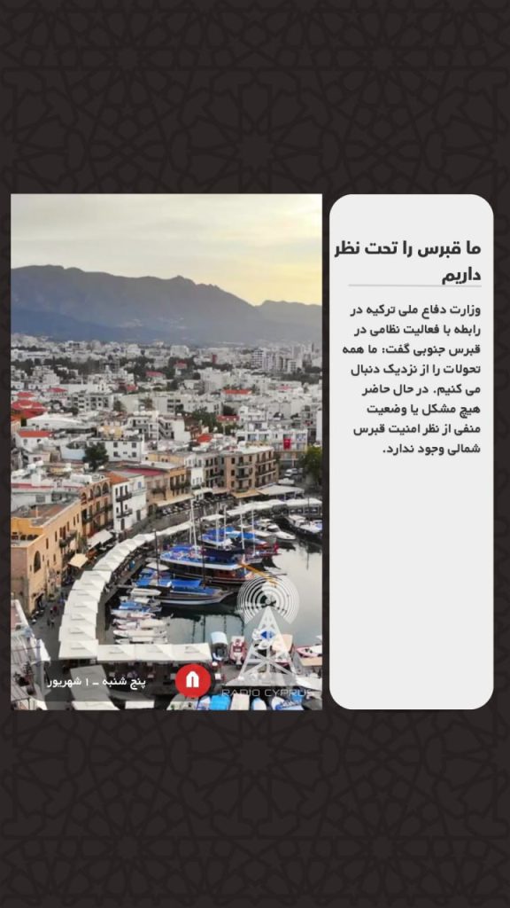 وزارت دفاع ملی ترکیه در رابطه با فعالیت نظامی در قبرس جنوبی گفت: ما همه تحولات را از نزدیک دنبال می کنیم. در حال حاضر هیچ مشکل یا وضعیت منفی از نظر امنیت قبرس شمالی وجود ندارد.