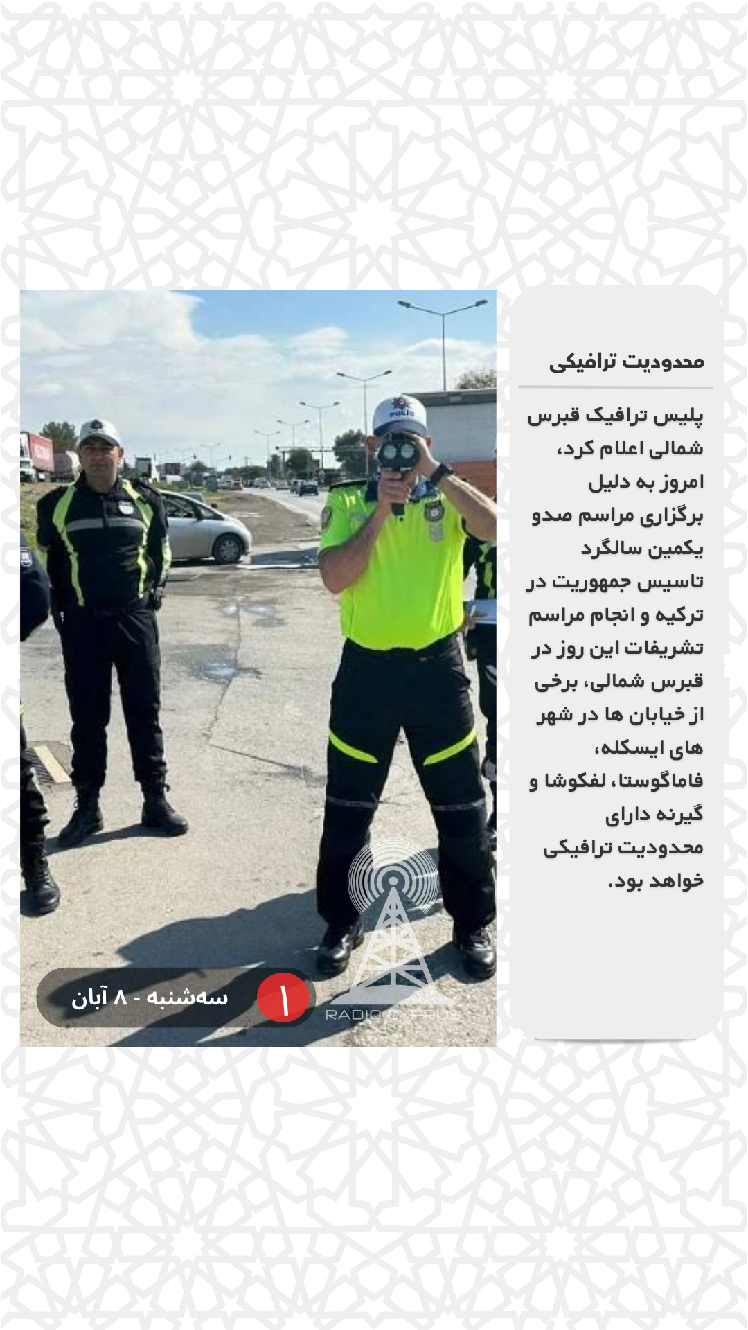پلیس ترافیک قبرس شمالی اعلام کرد، امروز به دلیل برگزاری مراسم صدو یکمین سالگرد تاسیس جمهوریت در ترکیه و انجام مراسم تشریفات این روز در قبرس شمالی، برخی از خیابان ها در شهر های ایسکله، فاماگوستا، لفکوشا و گیرنه دارای محدودیت ترافیکی خواهد بود.