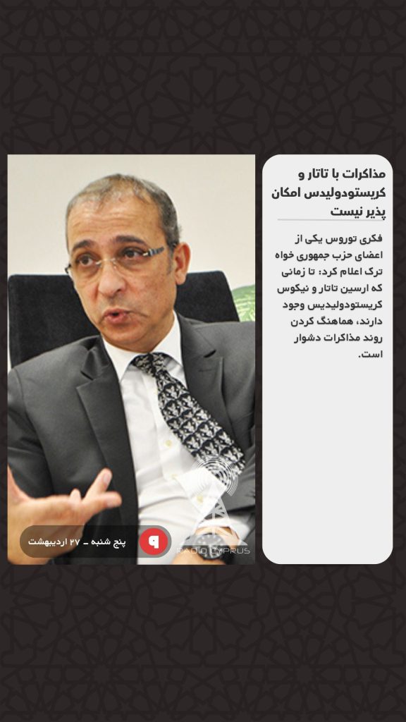 فکری توروس یکی از اعضای حزب جمهوری خواه ترک اعلام کرد: تا زمانی که ارسین تاتار و نیکوس کریستودولیدیس وجود دارند، هماهنگ کردن روند مذاکرات دشوار است.