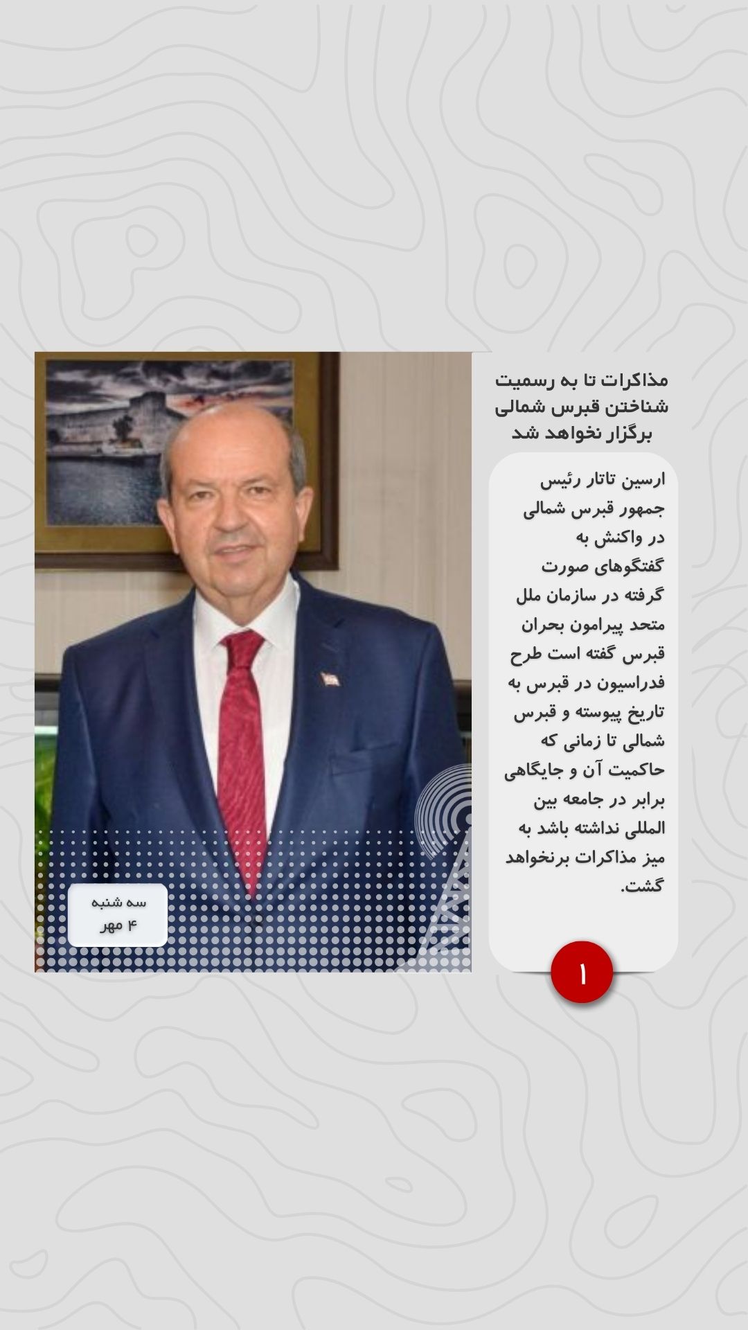 ارسین تاتار رئیس جمهور قبرس شمالی در واکنش به گفتگوهای صورت گرفته در سازمان ملل متحد پیرامون بحران قبرس گفته است طرح فدراسیون در قبرس به تاریخ پیوسته و قبرس شمالی تا زمانی که حاکمیت آن و جایگاهی برابر در جامعه بین المللی نداشته باشد به میز مذاکرات برنخواهد گشت.