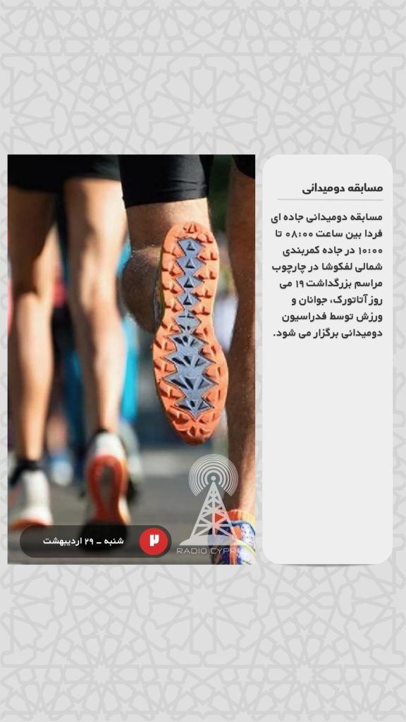 مسابقه دومیدانی جاده ای فردا بین ساعت ۰۸:۰۰ تا ۱۰:۰۰ در جاده کمربندی شمالی لفکوشا در چارچوب مراسم بزرگداشت ۱۹ می روز آتاتورک، جوانان و ورزش توسط فدراسیون دومیدانی برگزار می شود.