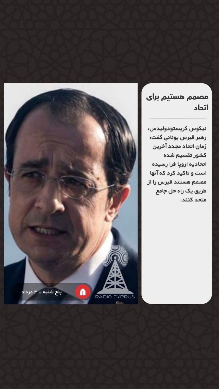 نیکوس کریستودولیدس، رهبر قبرس یونانی گفت: زمان اتحاد مجدد آخرین کشور تقسیم شده اتحادیه اروپا فرا رسیده است و تاکید کرد که آنها مصمم هستند قبرس را از طریق یک راه حل جامع متحد کنند.