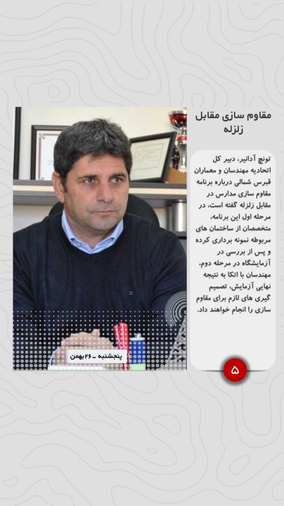 تونچ آدانیر، دبیر کل اتحادیه مهندسان و معماران قبرس شمالی درباره برنامه مقاوم سازی مدارس در مقابل زلزله گفته است، در مرحله اول این برنامه، متخصصان از ساختمان های مربوطه نمونه برداری کرده و پس از بررسی در آزمایشگاه در مرحله دوم، مهندسان با اتکا به نتیجه نهایی آزمایش، تصمیم گیری های لازم برای مقاوم سازی را انجام خواهند داد.