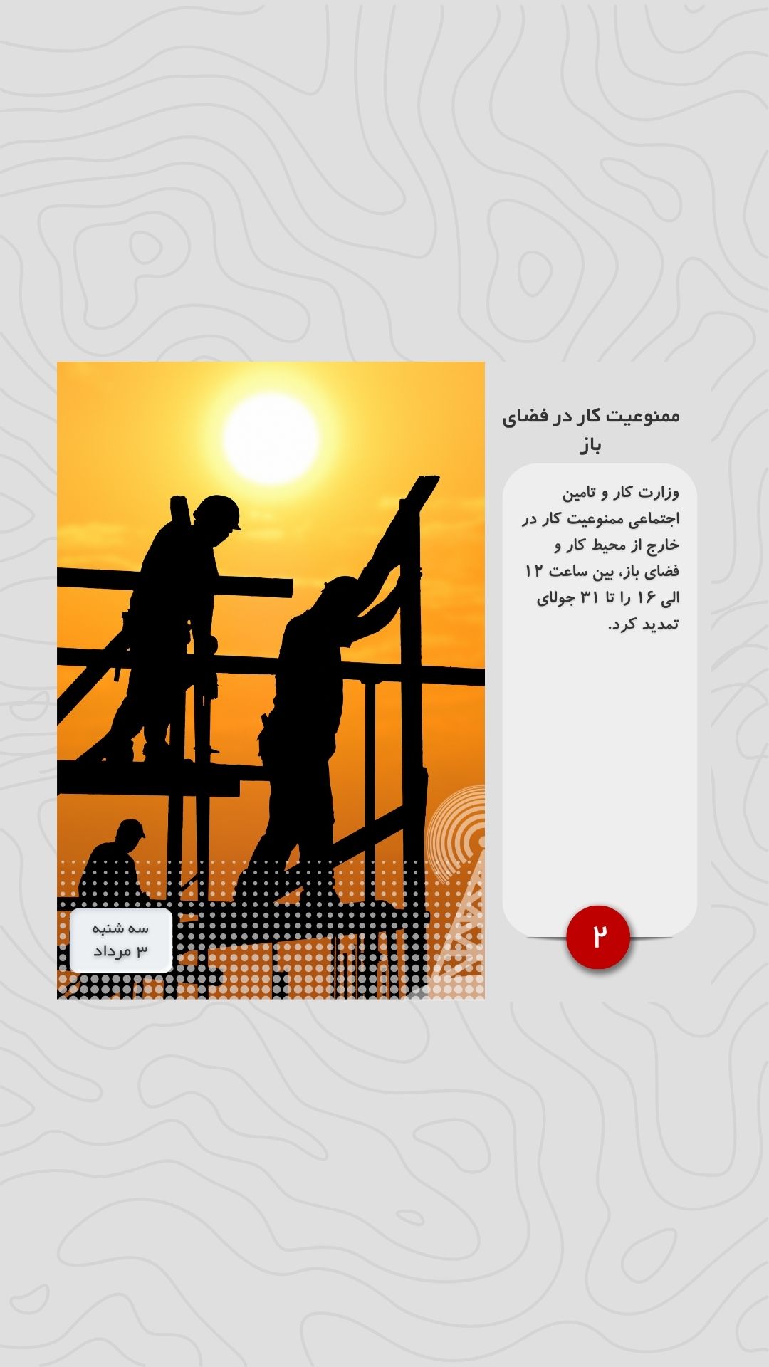 وزارت کار و تامین اجتماعی ممنوعیت کار در خارج از محیط کار و فضای باز، بین ساعت ۱۲ الی ۱۶ را تا ۳۱ جولای تمدید کرد.