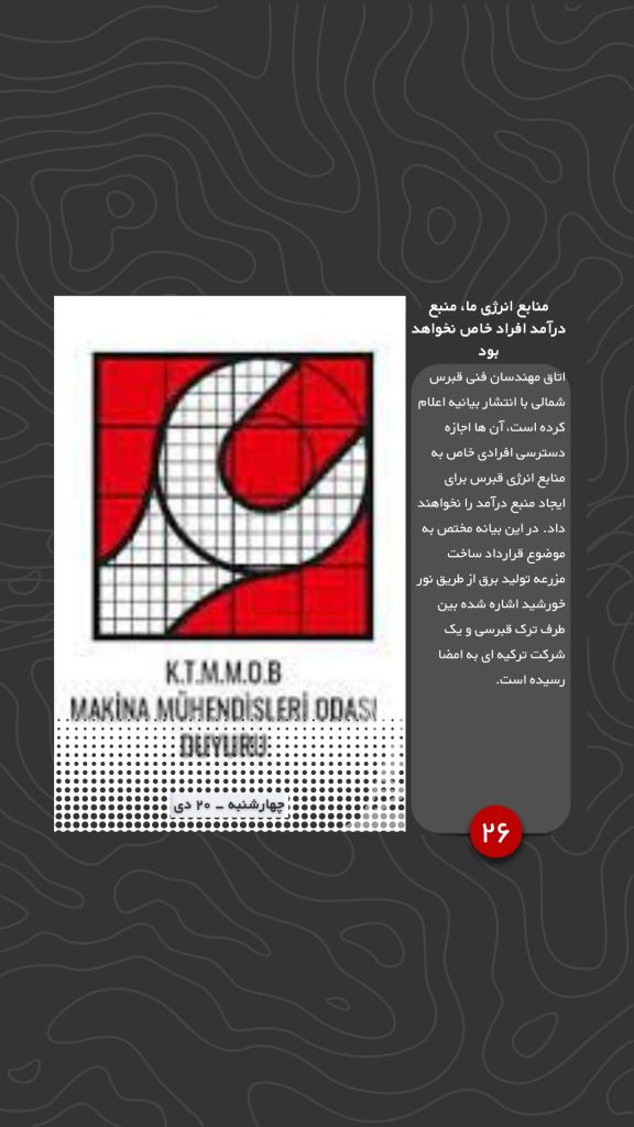 اتاق مهندسان فنی قبرس شمالی با انتشار بیانیه اعلام کرده است، آن ها اجازه دسترسی افرادی خاص به منابع انرژی قبرس برای ایجاد منبع درآمد را نخواهند داد. در این بیانه مختص به موضوع قرارداد ساخت مزرعه تولید برق از طریق نور خورشید اشاره شده بین طرف ترک قبرسی و یک شرکت ترکیه ای به امضا رسیده است.