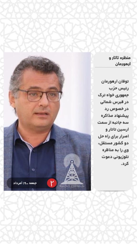 توفان ارهورمان رئیس حزب جمهوری خواه ترک در قبرس شمالی در خصوص رد پیشنهاد مذاکره سه جانبه از سمت ارسین تاتار و اصرار برای راه حل دو کشور مستقل، وی را به مناظره تلوزیونی دعوت کرد.
