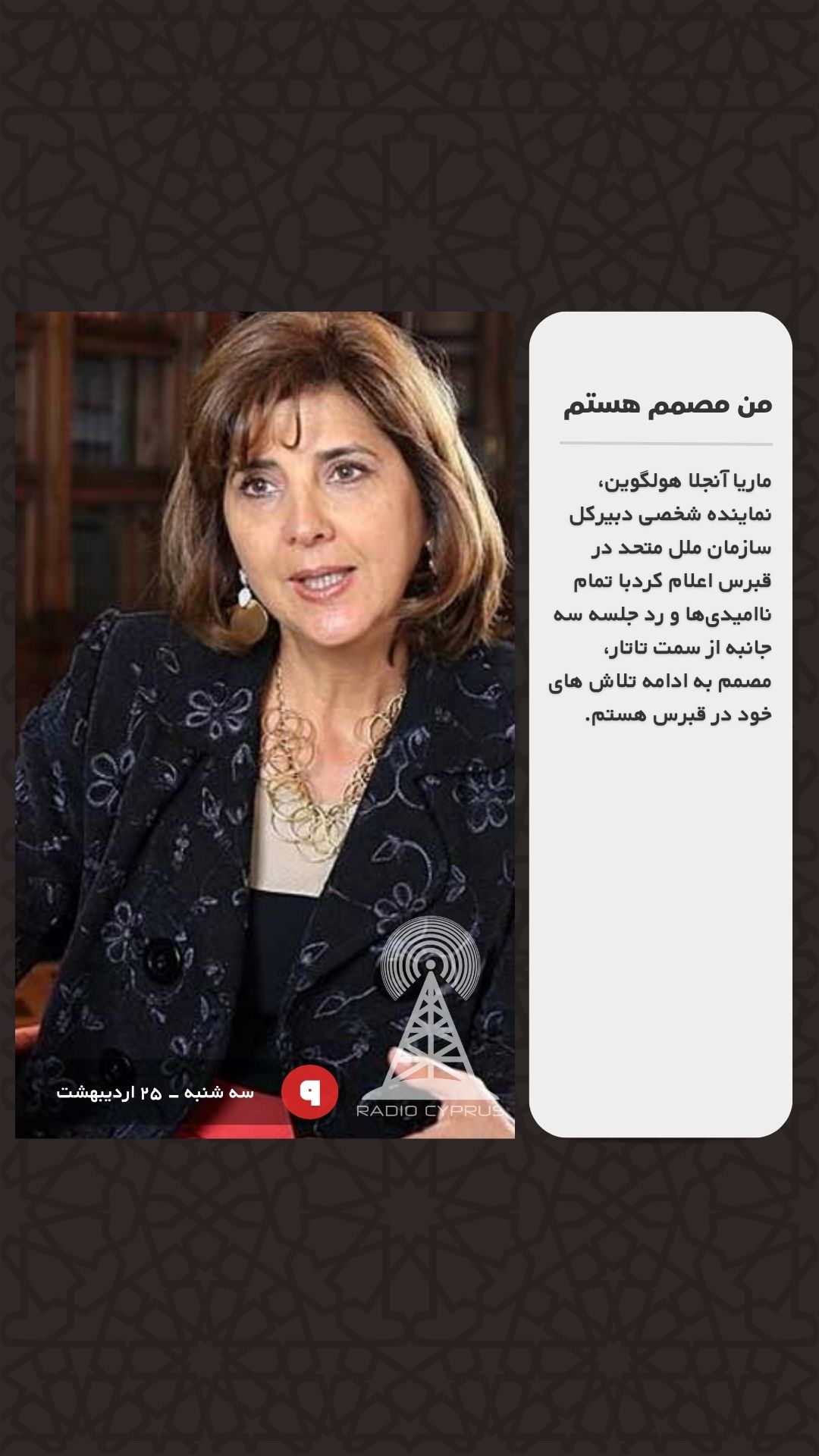 ماریا آنجلا هولگوین، نماینده شخصی دبیرکل سازمان ملل متحد در قبرس اعلام کردبا تمام ناامیدیها و رد جلسه سه جانبه از سمت تاتار، مصمم به ادامه تلاش های خود در قبرس هستم.