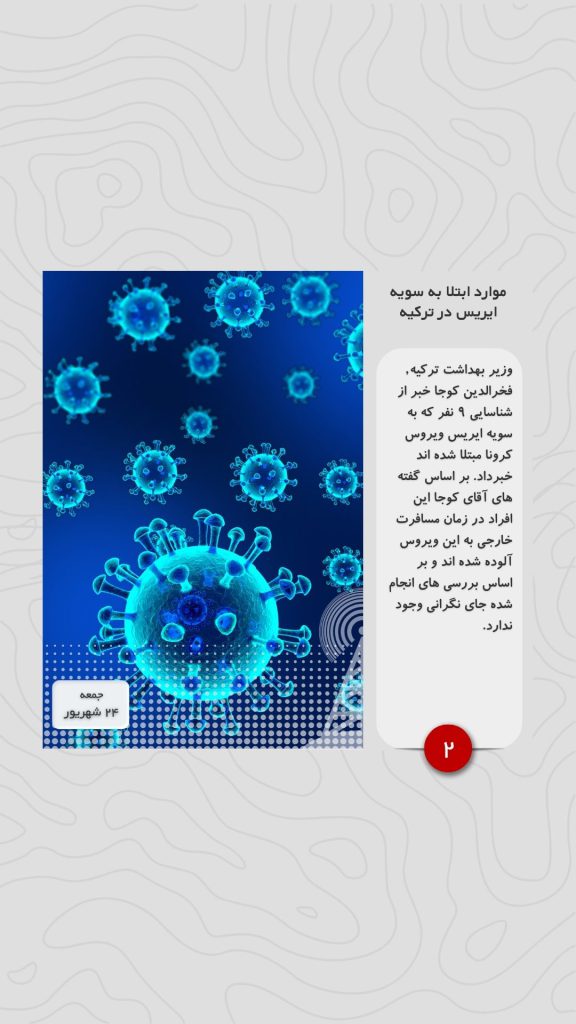 وزیر بهداشت ترکیه, فخرالدین کوجا خبر از شناسایی ۹ نفر که به سویه ایریس ویروس کرونا مبتلا شده اند خبرداد. بر اساس گفته های آقای کوجا این افراد در زمان مسافرت خارجی به این ویروس آلوده شده اند و بر اساس بررسی های انجام شده جای نگرانی وجود ندارد.