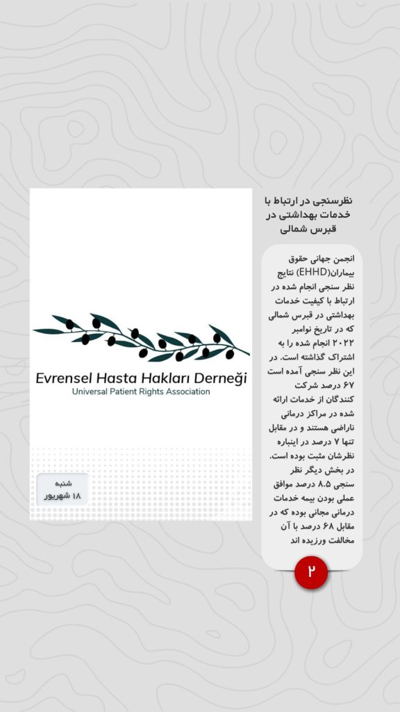 انجمن جهانی حقوق بیماران(EHHD) نتایج نظر سنجی انجام شده در ارتباط با کیفیت خدمات بهداشتی در قبرس شمالی که در تاریخ نوامبر ۲۰۲۲ انجام شده را به اشتراک گذاشته است. در این نظر سنجی آمده است ۶۷ درصد شرکت کنندگان از خدمات ارائه شده در مراکز درمانی ناراضی هستند و در مقابل تنها ۷ درصد در اینباره نظرشان مثبت بوده است. در بخش دیگر نظر سنجی ۸.۵ درصد موافق عملی بودن بیمه خدمات درمانی مجانی بوده که در مقابل ۶۸ درصد با آن مخالفت ورزیده اند