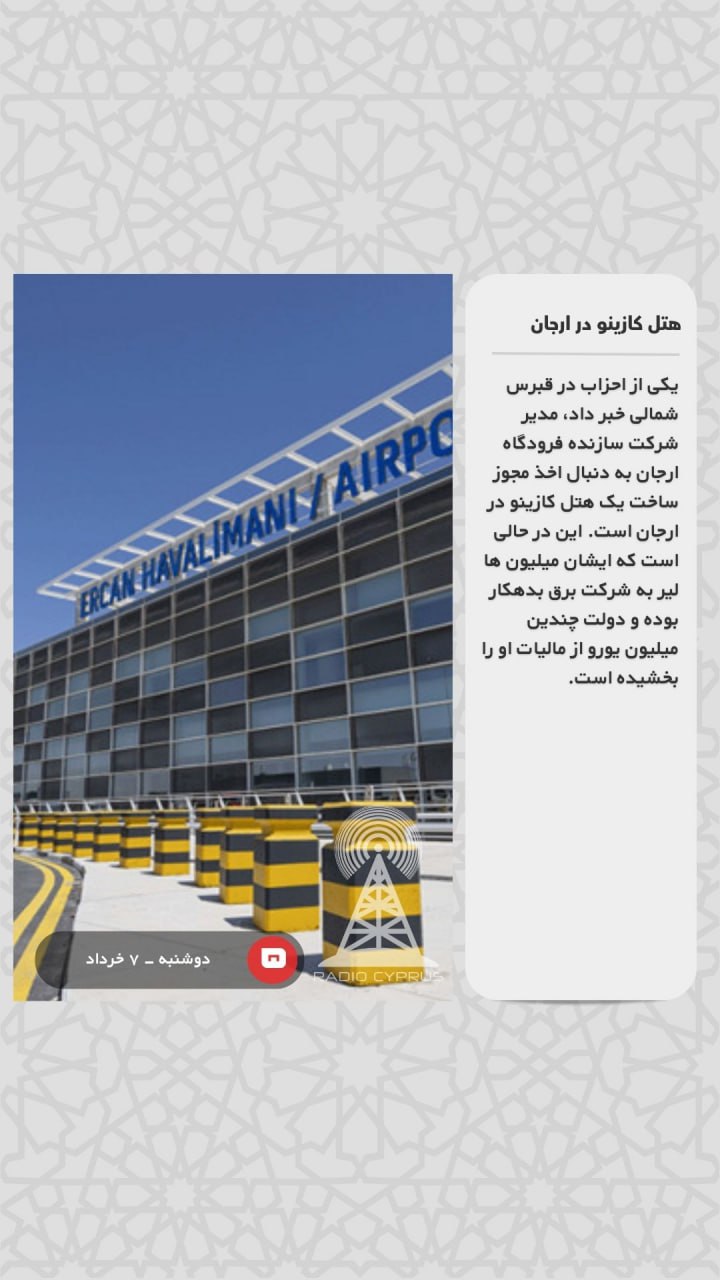 یکی از احزاب در قبرس شمالی خبر داد، مدیر شرکت سازنده فرودگاه ارجان به دنبال اخذ مجوز ساخت یک هتل کازینو در ارجان است. این در حالی است که ایشان میلیون ها لیر به شرکت برق بدهکار بوده و دولت چندین میلیون یورو از مالیات او را بخشیده است.