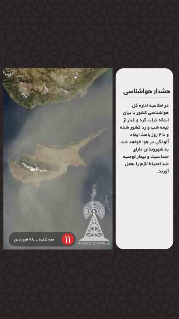 در اطلاعیه اداره کل هواشناسی کشور با بیان اینکه ذرات گرد و غبار از نیمه شب وارد کشور شده و تا ۲ روز باعث ایجاد آلودگی در هوا خواهد شد، به شهروندان دارای حساسیت و بیمار توصیه شد احتیاط لازم را بعمل آورند.