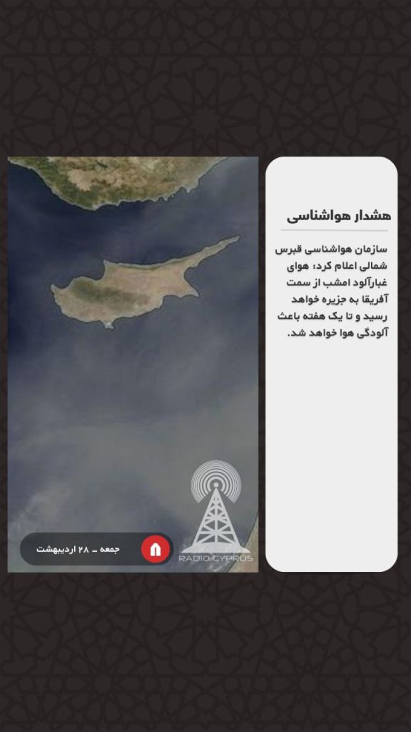 سازمان هواشناسی قبرس شمالی اعلام کرد: هوای غبارآلود امشب از سمت آفریقا به جزیره خواهد رسید و تا یک هفته باعث آلودگی هوا خواهد شد.