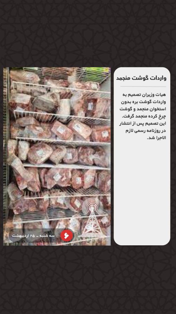 هیات وزیران تصمیم به واردات گوشت بره بدون استخوان منجمد و گوشت چرخ کرده منجمد گرفت. این تصمیم پس از انتشار در روزنامه رسمی لازم الاجرا شد.