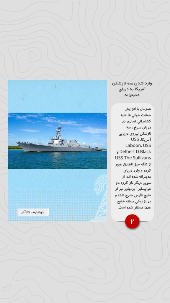همزمان با افزایش حملات حوثی ها علیه کشتیرانی تجاری در دریای سرخ ، سه ناوشکن نیروی دریایی آمریکا، USS Laboon، USS Delbert D.Black و USS The Sullivans از تنگه جبل الطارق عبور کرده و وارد دریای مدیترانه شده اند. از سویی دیگر ناو گروه ناو هواپیمابر آیزنهاور نیز از خلیج فارس خارج شده و در نزدیکی منطقه خلیج عدن مستقر شده است.