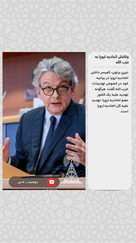 تیری برتون، کمیسر داخلی اتحادیه اروپا در بیانیه خود در خصوص تهدیدات حزب الله گفت: هرگونه تهدید علیه یک کشور عضو اتحادیه اروپا، تهدید علیه کل اتحادیه اروپا است.