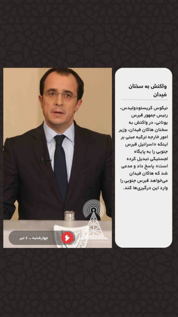 نیکوس کریستودولیدس، رئیس جمهور قبرس یونانی، در واکنش به سخنان هاکان فیدان، وزیر امور خارجه ترکیه مبنی بر اینکه «اسرائیل قبرس جنوبی را به پایگاه لجستیکی تبدیل کرده است» پاسخ داد و مدعی شد که هاکان فیدان میخواهد قبرس جنوبی را وارد این درگیریها کند.