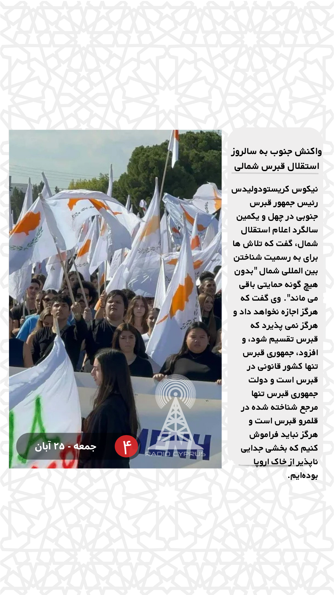 نیکوس کریستودولیدس رئیس جمهور قبرس جنوبی در چهل و یکمین سالگرد اعلام استقلال شمال، گفت که تلاش ها برای به رسمیت شناختن بین المللی شمال “بدون هیچ گونه حمایتی باقی می ماند”. وی گفت که هرگز اجازه نخواهد داد و هرگز نمی پذیرد که قبرس تقسیم شود، و افزود، جمهوری قبرس تنها کشور قانونی در قبرس است و دولت جمهوری قبرس تنها مرجع شناخته شده در قلمرو قبرس است و هرگز نباید فراموش کنیم که بخشی جدایی ناپذیر از خاک اروپا بودهایم.