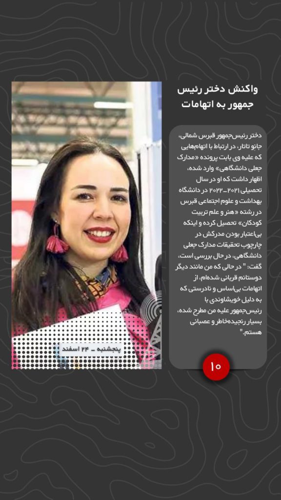 دختر رئیسجمهور قبرس شمالی، جانِو تاتار، در ارتباط با اتهامهایی که علیه وی بابت پرونده «مدارک جعلی دانشگاهی» وارد شده، اظهار داشت که او در سال تحصیلی ۲۰۲۱-۲۰۲۲ در دانشگاه بهداشت و علوم اجتماعی قبرس در رشته «هنر و علم تربیت کودکان» تحصیل کرده و اینکه بیاعتبار بودن مدرکش در چارچوب تحقیقات مدارک جعلی دانشگاهی، در حال بررسی است، گفت: ” در حالی که من مانند دیگر دوستانم قربانی شدهام، از اتهامات بیاساس و نادرستی که به دلیل خویشاوندی با رئیسجمهور علیه من مطرح شده، بسیار رنجیدهخاطر و عصبانی هستم.”