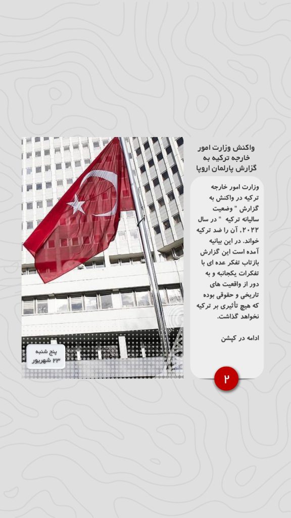وزارت امور خارجه ترکیه در واکنش به گزارش ” وضعیت سالیانه ترکیه ” در سال ۲۰۲۲, آن را ضد ترکیه خواند. در این بیانیه آمده است این گزارش بازتاب تفکر عده ای با تفکرات یکجانبه و به دور از واقعیت های تاریخی و حقوقی بوده که هیچ تأثیری بر ترکیه نخواهد گذاشت. در این بیانیه خاطرنشان شد که امید است مجلس جدیدی که پس از انتخابات پارلمان اروپا در سال آینده تشکیل می شود، با نگاهی بی طرفانه، منطقی و سازنده عمل کند.وزارت امور خارجه ترکیه در واکنش به گزارش ” وضعیت سالیانه ترکیه ” در سال ۲۰۲۲, آن را ضد ترکیه خواند. در این بیانیه آمده است این گزارش بازتاب تفکر عده ای با تفکرات یکجانبه و به دور از واقعیت های تاریخی و حقوقی بوده که هیچ تأثیری بر ترکیه نخواهد گذاشت. در این بیانیه خاطرنشان شد که امید است مجلس جدیدی که پس از انتخابات پارلمان اروپا در سال آینده تشکیل می شود، با نگاهی بی طرفانه، منطقی و سازنده عمل کند.