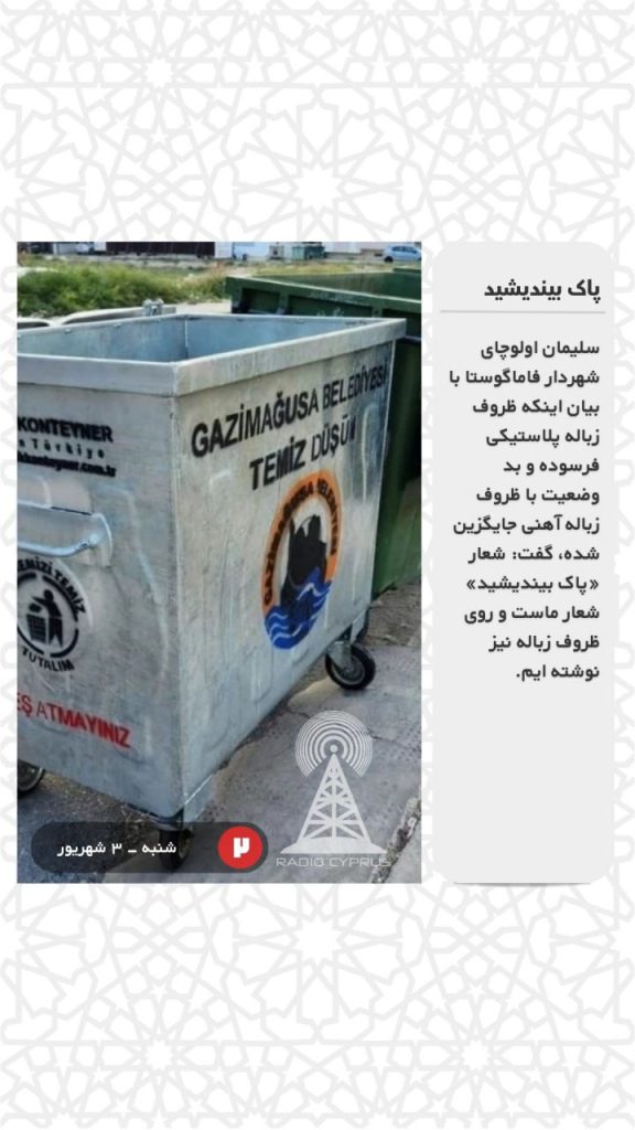 سلیمان اولوچای شهردار فاماگوستا با بیان اینکه ظروف زباله پلاستیکی فرسوده و بد وضعیت با ظروف زباله آهنی جایگزین شده، گفت: شعار «پاک بیندیشید» شعار ماست و روی ظروف زباله نیز نوشته ایم.