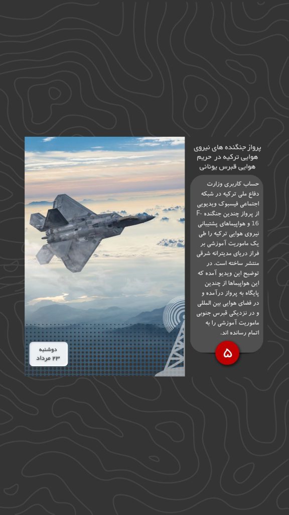 حساب کاربری وزارت دفاع ملی ترکیه در شبکه اجتماعی فیسبوک ویدیویی از پرواز چندین جنگنده F-16 و هواپیماهای پشتیبانی نیروی هوایی ترکیه را طی یک ماموریت آموزشی بر فراز دریای مدیترانه شرقی منتشر ساخته است. در توضیح این ویدیو آمده که این هواپیماها از چندین پایگاه به پرواز درآمده و در فضای هوایی بین المللی و در نزدیکی قبرس جنوبی ماموریت آموزشی را به اتمام رسانده اند.