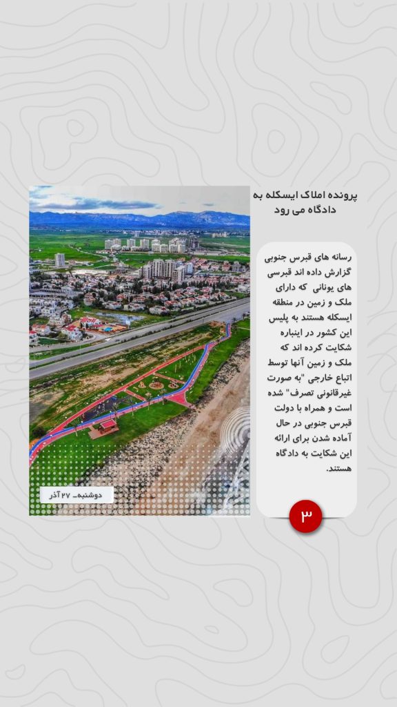 رسانه های قبرس جنوبی گزارش داده اند قبرسی های یونانی که دارای ملک و زمین در منطقه ایسکله هستند به پلیس این کشور در اینباره شکایت کرده اند که ملک و زمین آنها توسط اتباع خارجی “به صورت غیرقانونی تصرف” شده است و همراه با دولت قبرس جنوبی در حال آماده شدن برای ارائه این شکایت به دادگاه هستند.