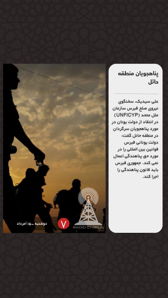 علی سیدیک، سخنگوی نیروی صلح قبرس سازمان ملل متحد (UNFICYP) در انتقاد از دولت یونان در مورد پناهجویان سرگردان در منطقه حائل گفت: دولت یونانی قبرس قوانین بین المللی را در مورد حق پناهندگی اعمال نمی کند. جمهوری قبرس باید قانون پناهندگی را اجرا کند.