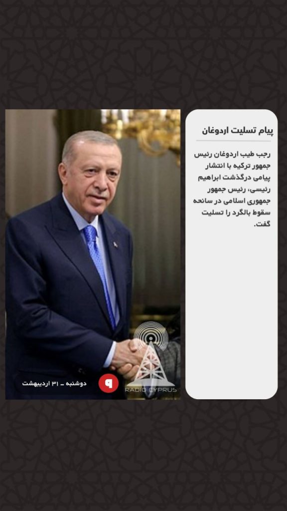 رجب طیب اردوغان رئیس جمهور ترکیه با انتشار پیامی درگذشت ابراهیم رئیسی، رئیس جمهور جمهوری اسلامی در سانحه سقوط بالگرد را تسلیت گفت.