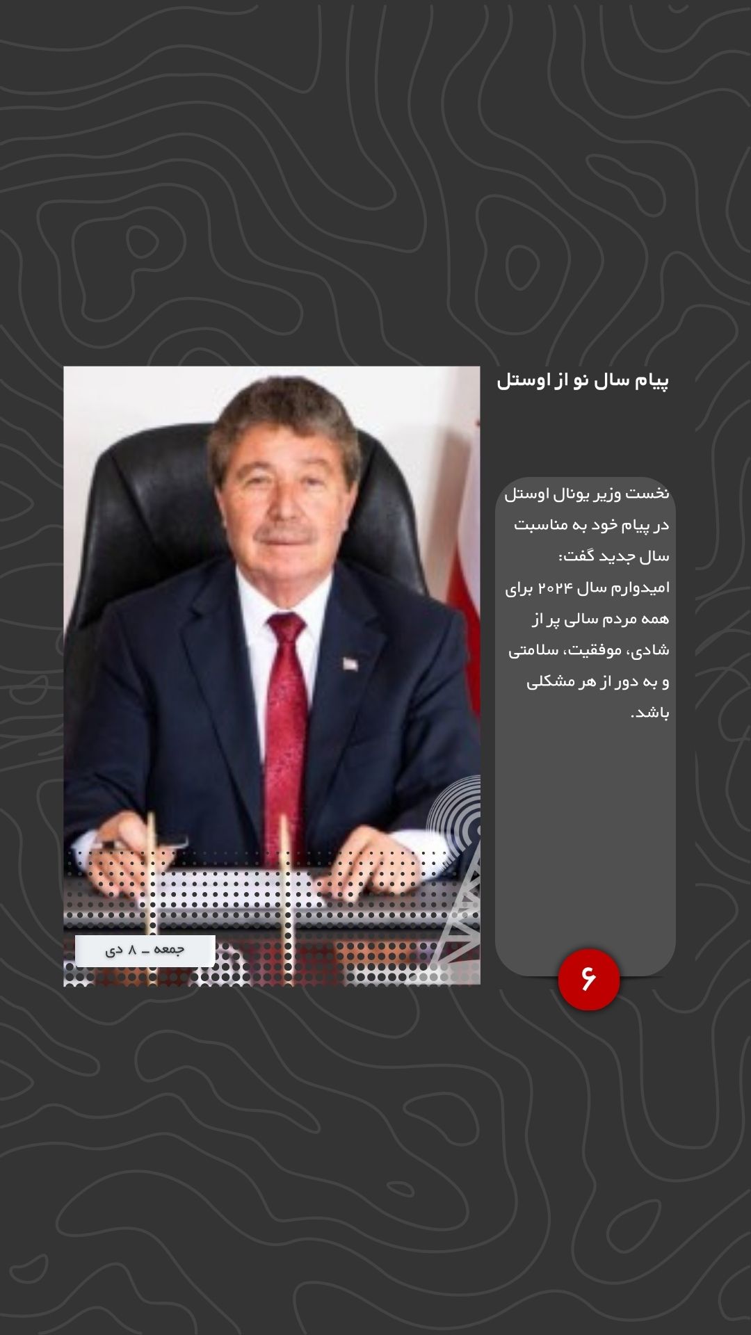 نخست وزیر یونال اوستل در پیام خود به مناسبت سال جدید گفت: امیدوارم سال ۲۰۲۴ برای همه مردم سالی پر از شادی، موفقیت، سلامتی و به دور از هر مشکلی باشد.
