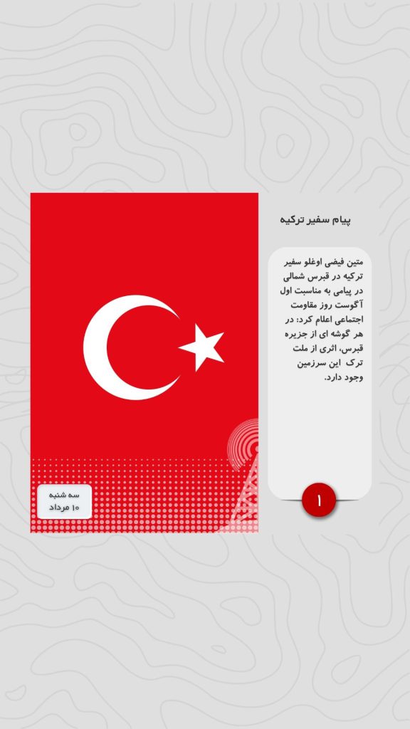 متین فیضی اوغلو سفیر ترکیه در قبرس شمالی در پیامی به مناسبت اول آگوست روز مقاومت اجتماعی اعلام کرد: در هر گوشه ای از جزیره قبرس، اثری از ملت ترک این سرزمین وجود دارد.