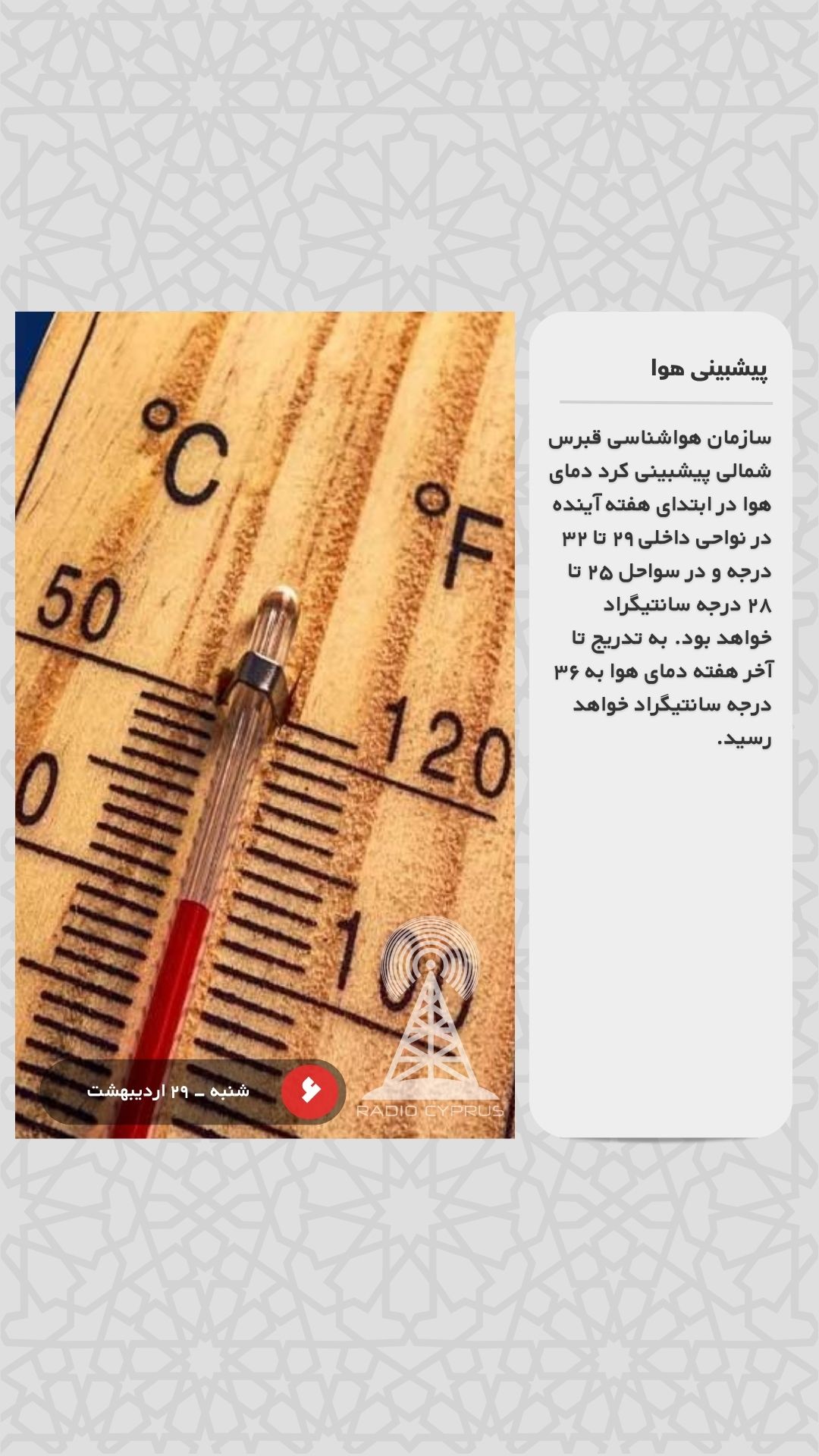 سازمان هواشناسی قبرس شمالی پیشبینی کرد دمای هوا در ابتدای هفته آینده در نواحی داخلی ۲۹ تا ۳۲ درجه و در سواحل ۲۵ تا ۲۸ درجه سانتیگراد خواهد بود. به تدریج تا آخر هفته دمای هوا به ۳۶ درجه سانتیگراد خواهد رسید.