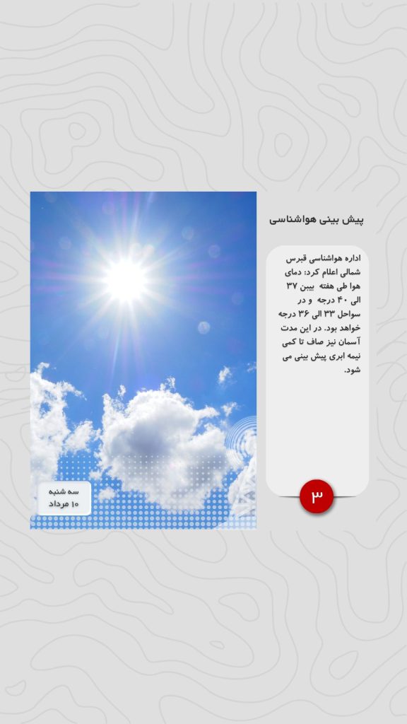 اداره هواشناسی قبرس شمالی اعلام کرد: دمای هوا طی هفته بیبن ۳۷ الی ۴۰ درجه و در سواحل ۳۳ الی ۳۶ درجه خواهد بود. در این مدت آسمان نیز صاف تا کمی نیمه ابری پیش بینی می شود.