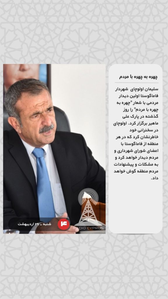 سلیمان اولوچای شهردار فاماگوستا اولین دیدار مردمی با شعار “چهره به چهره با مردم” را روز گذشته در پارک علی ماهیر برگزار کرد. اولوچای در سخنرانی خود خاطرنشان کرد که در هر منطقه از فاماگوستا با اعضای شورای شهرداری و مردم دیدار خواهد کرد و به مشکلات و پیشنهادات مردم منطقه گوش خواهد داد.
