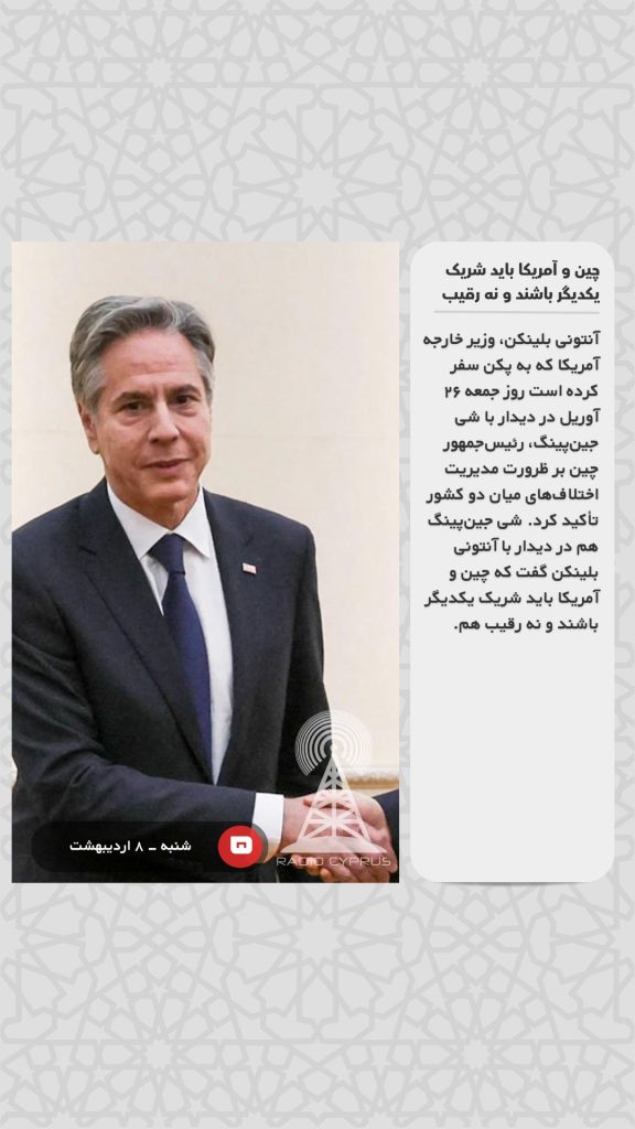 آنتونی بلینکن، وزیر خارجه آمریکا که به پکن سفر کرده است روز جمعه ۲۶ آوریل در دیدار با شی جین‌پینگ، رئیس‌جمهور چین بر ظرورت مدیریت اختلاف‌های میان دو کشور تأکید کرد. شی جین‌پینگ هم در دیدار با آنتونی بلینکن گفت که چین و آمریکا باید شریک یکدیگر باشند و نه رقیب هم.