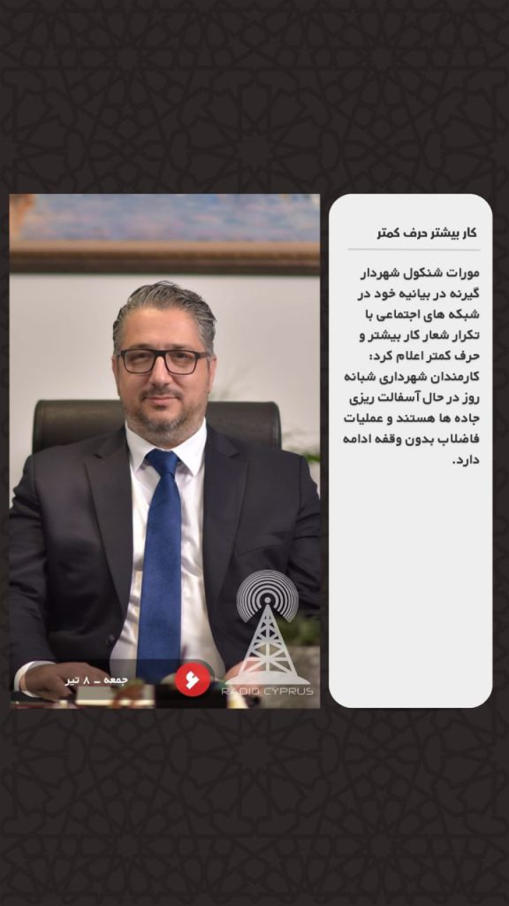 مورات شنکول شهردار گیرنه در بیانیه خود در شبکه های اجتماعی با تکرار شعار کار بیشتر و حرف کمتر اعلام کرد: کارمندان شهرداری شبانه روز در حال آسفالت ریزی جاده ها هستند و عملیات فاضلاب بدون وقفه ادامه دارد.