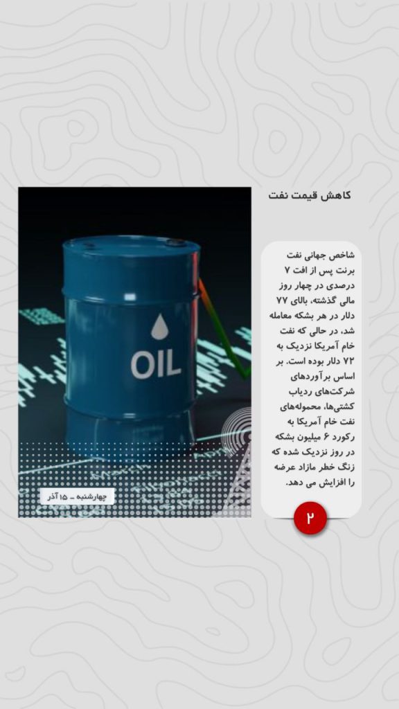 شاخص جهانی نفت برنت پس از افت ۷ درصدی در چهار روز مالی گذشته، بالای ۷۷ دلار در هر بشکه معامله شد، در حالی که نفت خام آمریکا نزدیک به ۷۲ دلار بوده است. بر اساس برآوردهای شرکت‌های ردیاب کشتی‌ها، محموله‌های نفت خام آمریکا به رکورد ۶ میلیون بشکه در روز نزدیک شده که زنگ خطر مازاد عرضه را افزایش می دهد.