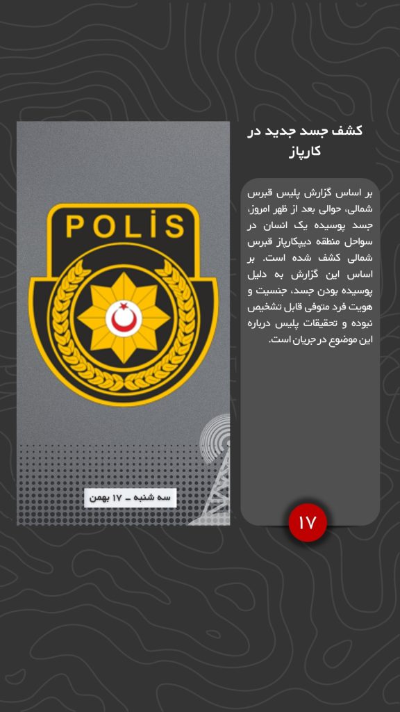 بر اساس گزارش پلیس قبرس شمالی، حوالی بعد از ظهر امروز، جسد پوسیده یک انسان در سواحل منطقه دیپکارپاز قبرس شمالی کشف شده است. بر اساس این گزارش به دلیل پوسیده بودن جسد، جنسیت و هویت فرد متوفی قابل تشخیص نبوده و تحقیقات پلیس درباره این موضوع در جریان است.