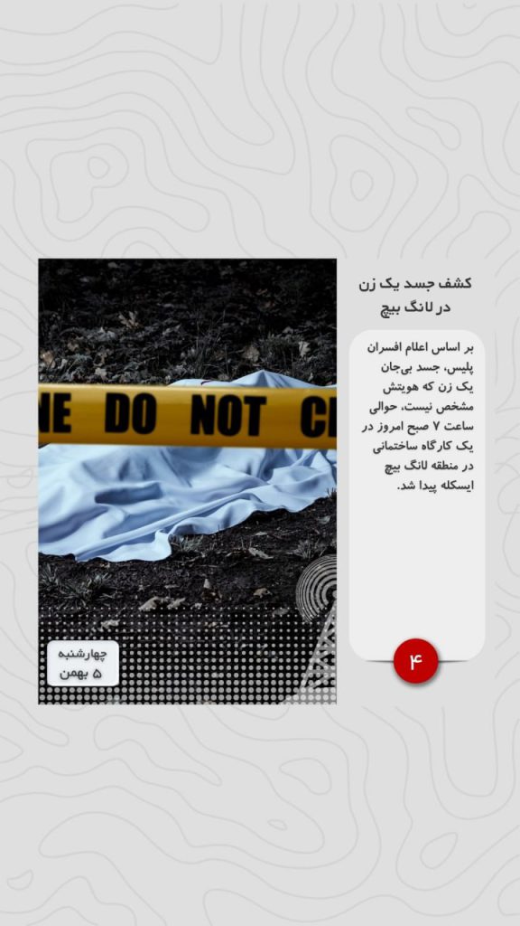 بر اساس اعلام افسران پلیس، جسد بیجان یک زن که هویتش مشخص نیست، حوالی ساعت ۷ صبح امروز در یک کارگاه ساختمانی در منطقه لانگ بیچ ایسکله پیدا شد.