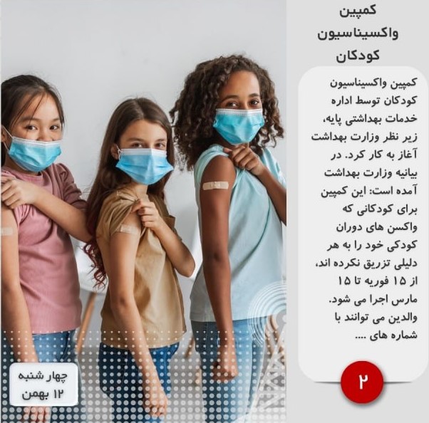 کمپین واکسیناسیون کودکان توسط اداره خدمات بهداشتی پایه، زیر نظر وزارت بهداشت آغاز به کار کرد. در بیانیه وزارت بهداشت آمده است: این کمپین برای کودکانی که واکسن های دوران کودکی خود را به هر دلیلی تزریق نکرده اند، از ۱۵ فوریه تا ۱۵ مارس اجرا می شود. والدین می توانند با شماره های ۰۳۹۲۲۲۷۴۸۶۰ و ۰۳۹۲۲۲۸۳۰۱۶ تماس بگیرند.