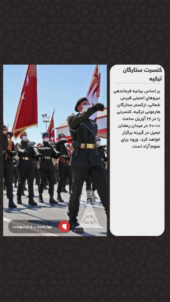بر اساس بیانیه فرماندهی نیروهای امنیتی قبرس شمالی، ارکستر ستارگان هارمونی ترکیه، کنسرتی را در ۲۶ آوریل ساعت ۲۰:۰۰ در میدان رمضان جمیل در گیرنه برگزار خواهد کرد. ورود برای عموم آزاد است.