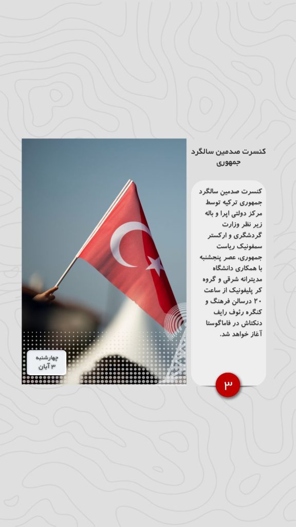 کنسرت صدمین سالگرد جمهوری ترکیه توسط مرکز دولتی اپرا و باله زیر نظر وزارت گردشگری و ارکستر سمفونیک ریاست جمهوری، عصر پنجشنبه با همکاری دانشگاه مدیترانه شرقی و گروه کر پلیفونیک از ساعت ۲۰ درسالن فرهنگ و کنگره رئوف رایف دنکتاش در فاماگوستا آغاز خواهد شد.