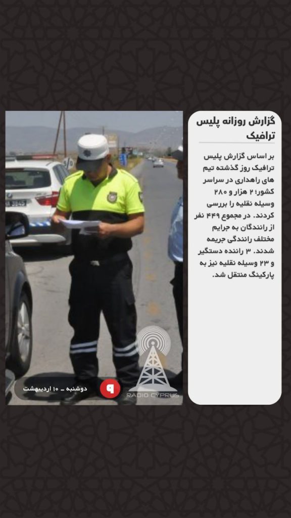 بر اساس گزارش پلیس ترافیک روز گذشته تیم های راهداری در سراسر کشور؛ ۲ هزار و ۲۸۰ وسیله نقلیه را بررسی کردند. در مجموع ۴۴۹ نفر از رانندگان به جرایم مختلف رانندگی جریمه شدند. ۳ راننده دستگیر و ۲۳ وسیله نقلیه نیز به پارکینگ منتقل شد.