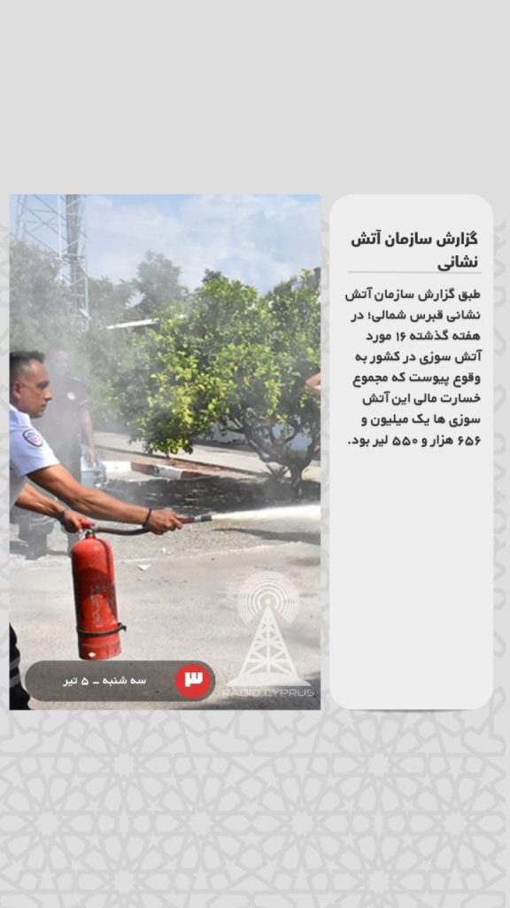 طبق گزارش سازمان آتش نشانی قبرس شمالی؛ در هفته گذشته ۱۶ مورد آتش سوزی در کشور به وقوع پیوست که مجموع خسارت مالی این آتش سوزی ها یک میلیون و ۶۵۶ هزار و ۵۵۰ لیر بود.