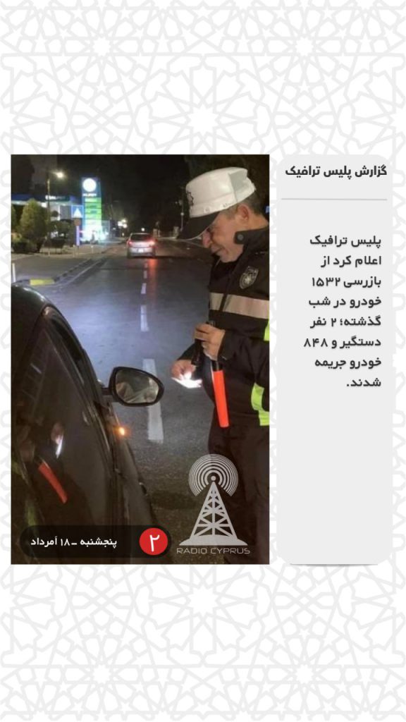 پلیس ترافیک اعلام کرد از بازرسی ۱۵۳۲ خودرو در شب گذشته؛ ۲ نفر دستگیر و ۸۴۸ خودرو جریمه شدند.