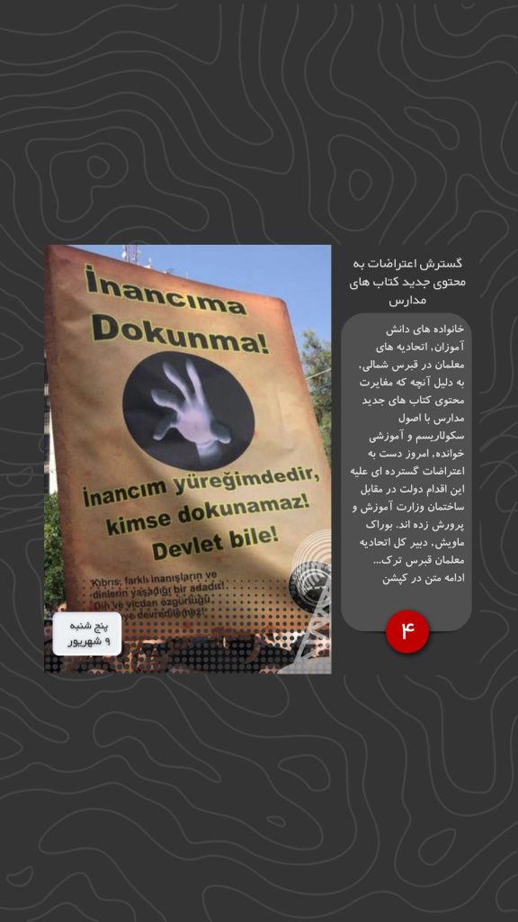 خانواده های دانش آموزان, اتحادیه های معلمان در قبرس شمالی, به دلیل آنچه که مغایرت محتوی کتاب های جدید مدارس با اصول سکولاریسم و آموزشی خوانده, امروز دست به اعتراضات گسترده ای علیه این اقدام دولت در مقابل ساختمان وزارت آموزش و پرورش زده اند. بوراک ماویش, دبیر کل اتحادیه معلمان قبرس ترک(KTÖS) در جریان این اعتراضات گفته است, اگر کتاب ها برداشته نشوند, معلم ها به خوبی می دانند چه کاری باید صورت بگیرد, آقای ناظم(وزیر آموزش و پرورش) باید به ما اعتماد کند.