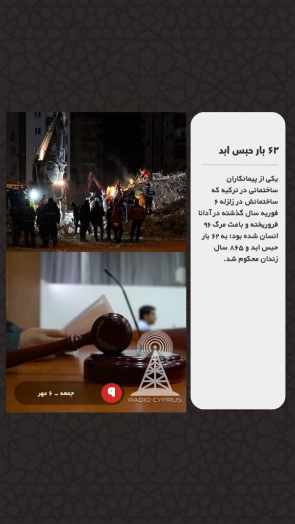 یکی از پیمانکاران ساختمانی در ترکیه که ساختمانش در زلزله ۶ فوریه سال گذشته در آدانا فروریخته و باعث مرگ ۹۶ انسان شده بود؛ به ۶۲ بار حبس ابد و ۸۶۵ سال زندان محکوم شد.